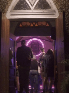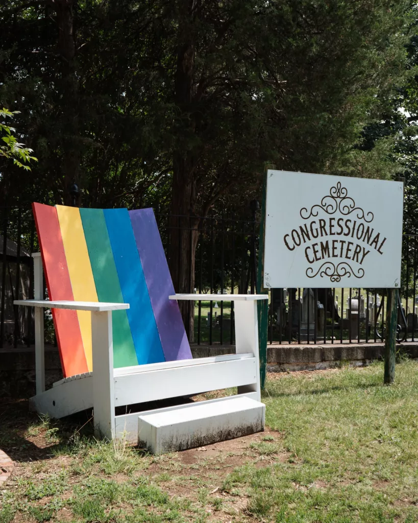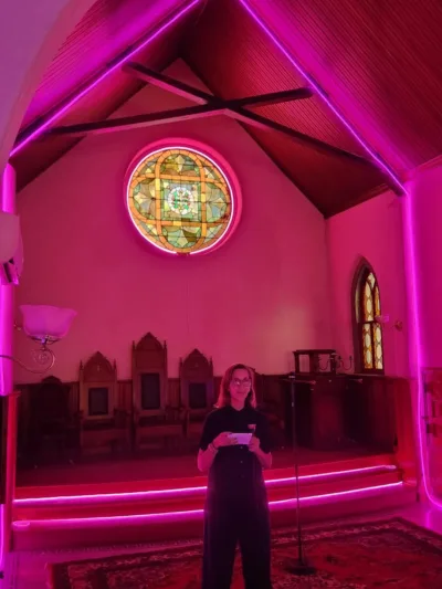 As Historic Congressional Cemetery is designed to support grieving as it manifests—its architecture and natural landscape offer a venue for grief to be acknowledged, carried, and with Davis’ work, shared. In line with other light and sound based-works, Davis bathed the Chapel in a deep magenta light, emanating from a bespoke LED neon installation hosted for a single night. This architectural intervention followed the roof lines of the Chapel’s unique architecture and will be an aesthetic motif for the whole series when it travels to other cemeteries. The bright color is meant to evoke a kind of karaoke club, built in such a way as to transport the singer to an alternative time and place.