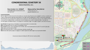 Start and finish are within the cemetery, and the course goes out on the adjoining Anacostia Trail for a quick out and back. Water is available at the start/finish line and at a water stop around the halfway point of the 5k course.