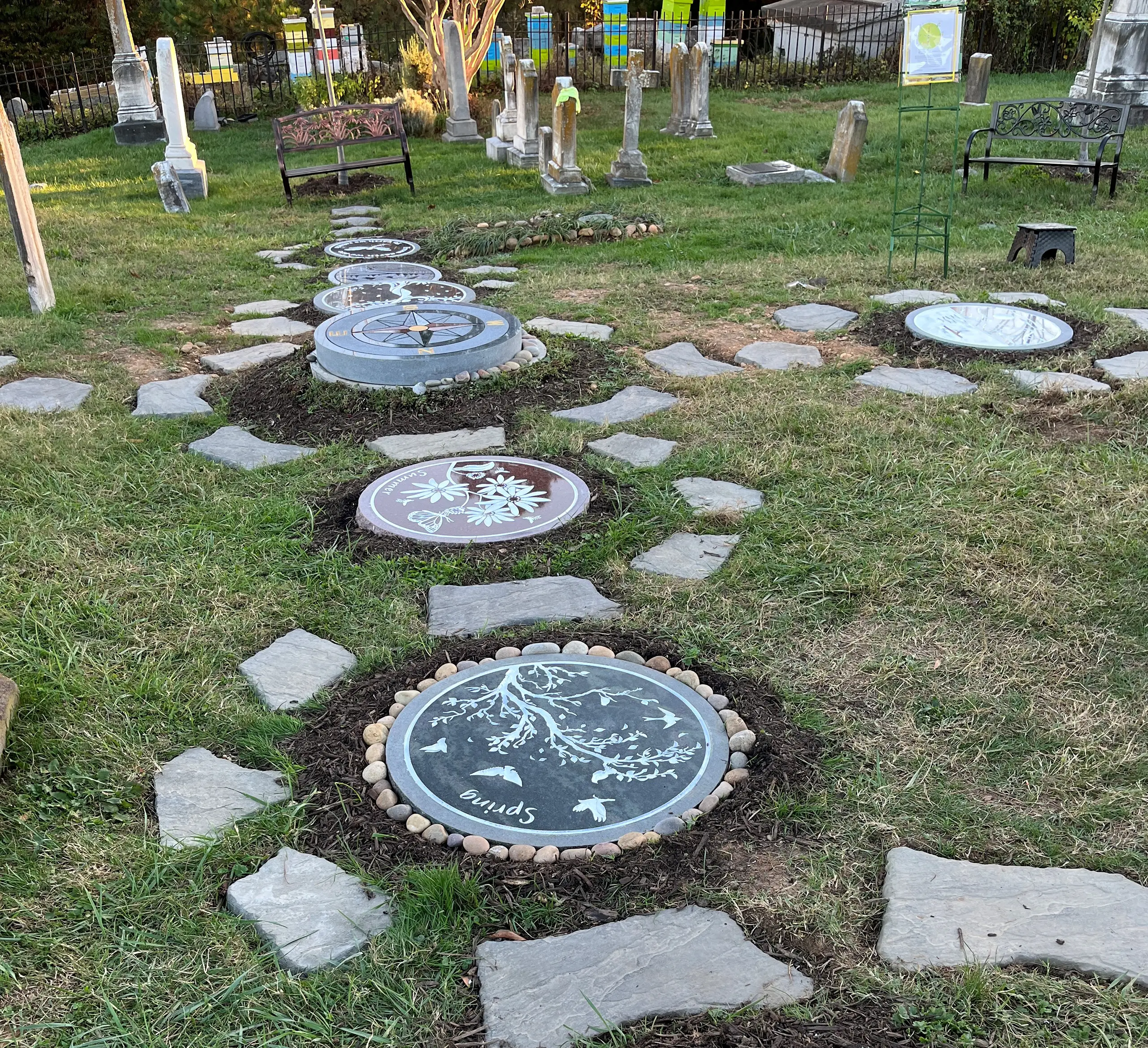 Steppingstone paths wander among granite engravings and scenes of nature. The trees, stoneworks and open horizon invite visitors to pay homage to the environment by stopping, listening, walking, and observing the surrounding flora and fauna. The slope overlooks humming beehives, a row of venerable family tombs and a pet cemetery. In the distance beyond the tree line is the confluence of the Anacostia and Potomac Rivers.
