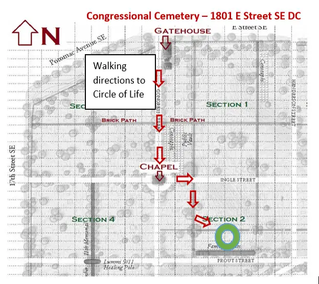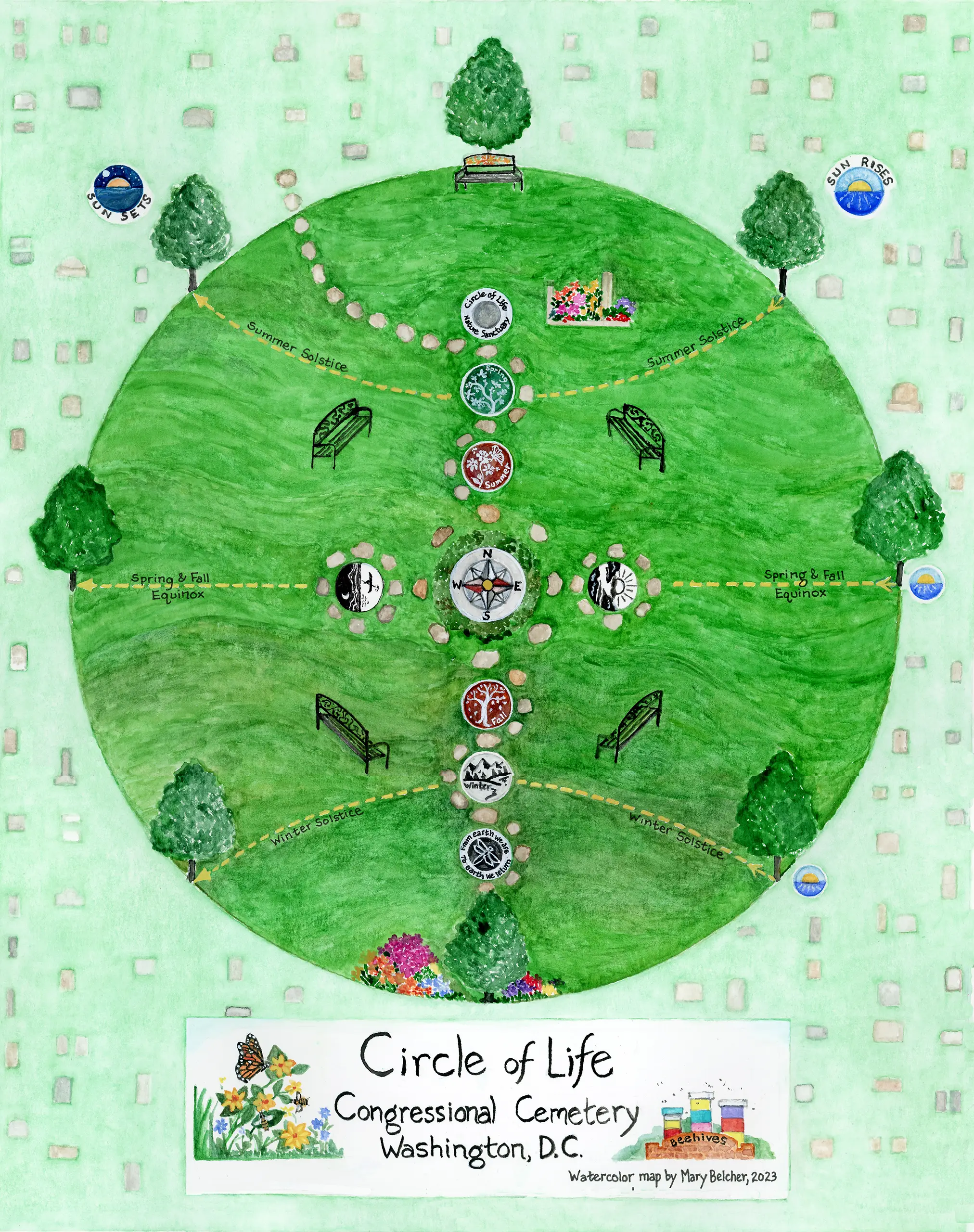 In partnership with Congressional Cemetery, the Circle of Life was created and funded by Sharon Metcalf and Circle collaborators — Nancy Brennan, Kay Tatum, Mary Kay Blake and Margaret Tobey, all of whom chose gravesites within the Circle for their final resting place. For details, email metcalf.sharon@gmail.com .