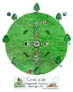 Plans for the Circle of Life began in 2019 when a group of friends, interested in the history of Congressional Cemetery and in green burial, collaborated with cemetery staff and Casey Trees to plant a grove of trees and create a sylvan sanctuary on the relatively barren SE hillside.