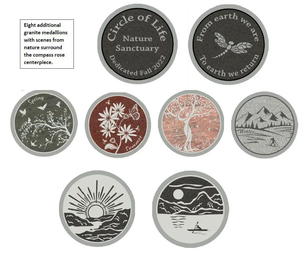 Along the north to south axis of the Circle, and surrounding the compass, are eight engraved roundels that present a visual narrative of earth’s natural cycles. The granite medallions portray the four seasons, flora and fauna, and sunrise and sunset. As simple contemporary depictions, the rock carvings are somewhat akin to the petroglyphs left by indigenous peoples to teach, warn, or pass on significant messages to their descendants.