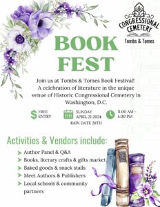 Calling all bookworms! Join us this Spring at HCC’S first ever Tombs & Tomes Book Festival! Experience the enchantment of books, stories, and the written word in our unique and historic cemetery venue in Washington D.C. Dozens of local authors, publishers, purveyors of seasonal snacks, and book-themed arts and crafts artists will be here at the cemetery, ready to wow and dazzle all book lovers with their offerings.